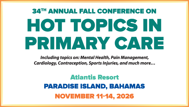 Our 34th Annual Fall Conference on Hot Topics in Primary Care is designed for physicians, nurse practitioners, physician associates, nurses, and other allied healthcare professionals involved in the primary care of their patients. Covering a wide array of topics, our expert faculty will discuss the latest evidence-based advancements in primary care, present emerging clinical data, and provide skills and strategies for application and implementation into your practice. This educational activity aims to increase learner knowledge, improve the competence and performance of all attendees, and contribute to their ability to work together as part of a coordinated healthcare team.